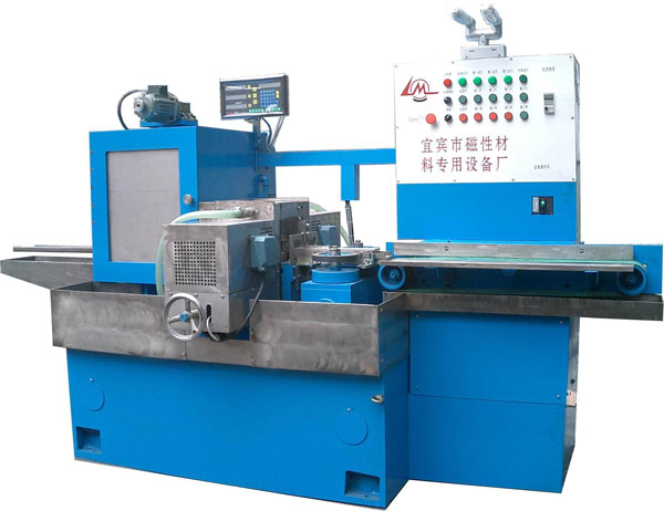 XNGM1型瓦形磁体弦宽内弧拱高复合磨主要用于磨削磁瓦两个弦宽端面和粗磨内弧或内弧及拱高,尤其适合于在采用通过式磨削磁瓦内外弧时的前工序,即用本设备磨削出弦宽和内弧拱高基准,为后工序顺利磨削奠定基础。本机采用复合工序,自动送进,在一次摆坯中同时加工弦宽和内弧拱高两个参数,即第一个工位磨弦宽,第二个工位磨内弧或内弧拱高。操作者只需把坯件按次序摆上传送带即可。